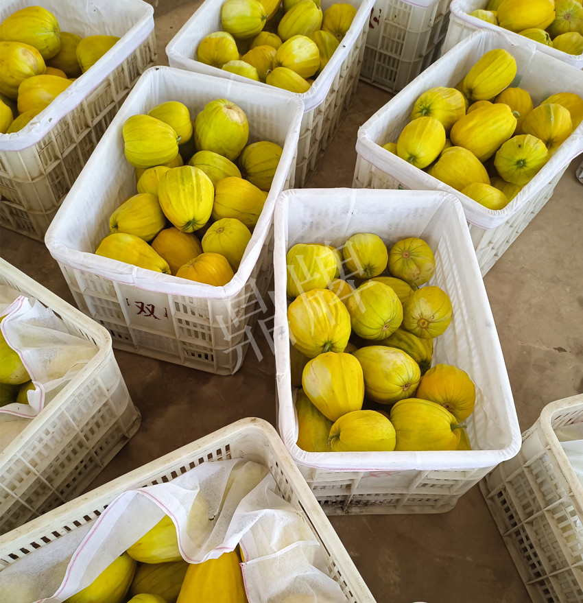 于是,我在今年春季種上了“秋甜1號”,今年共種了100多畝地的甜瓜,現(xiàn)在給大家分享的是抗高溫能力最強的“秋甜1號”。該品種果色金黃,果型端正,甜度高。到6月16日就大量上市了,此時批發(fā)價1.8元/斤。我們都是裝箱批發(fā),一箱箱的瓜真是漂亮,根本不愁銷路。