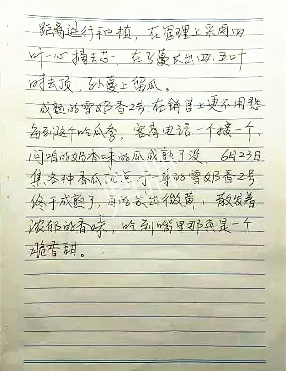 我今年種植的是鼎牌公司2023年推出的新品種雪奶香2號,雪奶香2號是1號的升級版,肉更厚、更甜的新品種。我們這里都是麥田套種,采用行距1.9米,株距七十公分的距離進(jìn)行種植,在管理上采用四葉一心摘去芯,在子蔓長出四、五葉時去頂,孫蔓上留瓜。